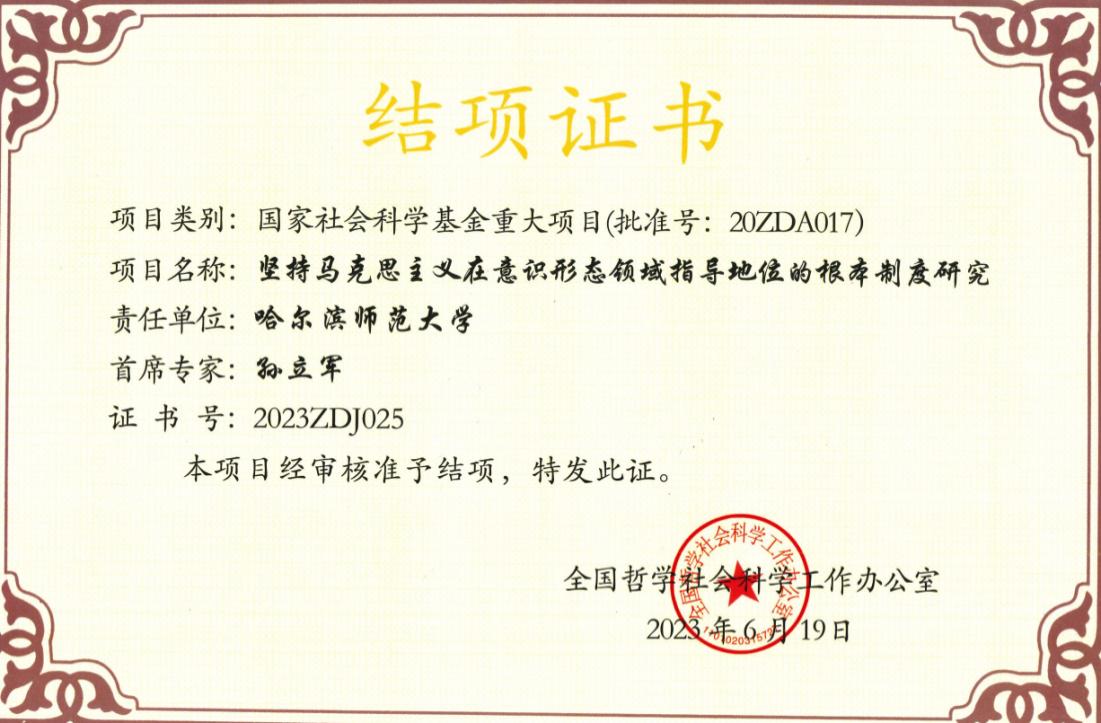 近日,我校孙立军教授主持的国家社会科学基金重大项目“坚持马克思主义在意识形态领域指导地位的根本制度研究”(项目编号:20ZDA017)顺利通过结题(结项证书号:2023ZDJ025),也是我校首个结题的国家社科基金重大项目,该项目主要合作单位为东北农业大学。
